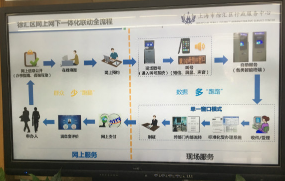 徐汇区行政服务中心目前入驻了区26个部门,办理440个审批和服务事项,所有业务整合为一个终端、一个入口、一个界面,政府的云平台打破了信息壁垒和“孤岛”,信息互联互通,按需共享。田林地区要开一家带买书的咖啡店,企业拿到营业执照后,中心告知对方还需办理餐饮和出版物经营许可证。这些信息同时告知了市场监管局和文化局。可之后两个部门执法人员上门巡查时,发现咖啡店只有出版物许可证,却迟迟没办餐饮经营许可证。田林市场监管所得到信息后,上门约谈责令整改。两个月后,咖啡店终于办出食品经营许可证。宋开成说:“来源可查、去向可追,所有的审批、处罚等监管信息都在网上流转,形成了完整的综合监管‘闭环’,解决问题也进入了‘快车道’。”