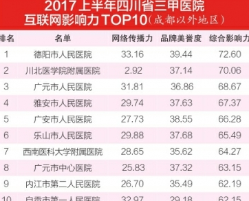 在四川省第二届院长城市圈高峰论坛暨第五届“榜样中国·我心目中的名医”大型公益评选活动颁奖典礼上,封面舆情公布了2017年上半年四川首份医疗重大舆情和大数据。数据分析显示,四川大学华西医院和华西第二医院占据成都地区三甲医院上半年互联网影响力前两位,这也是全省影响力最高的两家三甲医院,彰显了“华西”的品牌实力。此外,成都市第二人民医院夺得互联网影响力第三,超过了四川省人民医院,颇有“黑马”之风。而成都以外的三甲医院中,德阳市人民医院排名第一,且是网络传播力和品牌美誉度两个分项的第一。
