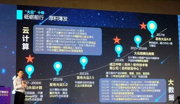 中国移动“大云4.0”平台包含云计算、大数据技术和平台产品,拥有Hadoop系统、搜索引擎、Pass平台、大云数据中心操作系统等26项核心产品,能够实现在大IT技术架构下的全新平台、服务和生态构建能力,可以为各行业提供公有云、私有云、混合云、专有云、行业云总体解决方案。