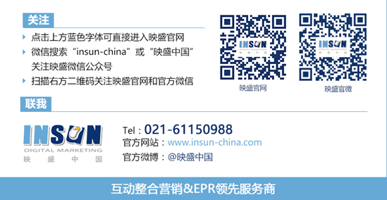 映盛中国(INSUN CHINA),作为最早涉足互联网营销的专业服务商,在互联网互动整合营销和移动营销领域拥有强大实力和卓越口碑,立足于多套自主开发专利技术的互联网营销与网络公关执行分析系统矩阵,为客户提供:互联网互动整合营销规划与执行,互联网公共关系(EPR),社会化媒体营销策略制定与实现,移动营销策略制定与执行,互联网舆情定制化解决方案&分析报告,以及快速实现销售线索或品牌效应增长的各类整合营销服务组合。