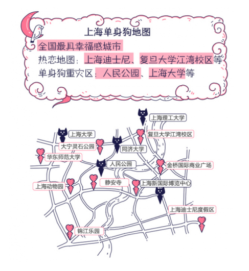 上海单身狗的重灾区是有着“全宇宙相亲中心”的称号的人民公园,另上海大学也有上榜。而热恋聚集区则是上海迪士尼和复旦大学的江湾校区。