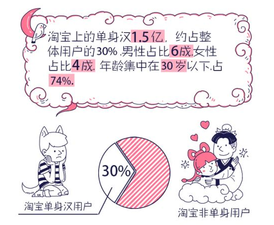 在淘宝、天猫平台,阿里巴巴的大数据分析出,约有1.5亿单身狗,占比30%,其中男性占比60%,女性40%。