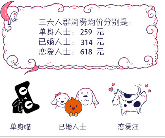 今年七夕,恋爱人士的平均花费是618元,已婚人士平均花费314元,单身狗的平均花费是259元。40%的单身狗有七夕花销,剩下的则没有。
