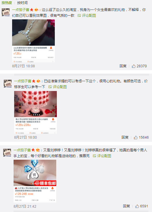 为“认真过节”,情侣们从8月13日就提前消费为对方准备礼物。然并卵,不少男性不知道送女友什么好,因此淘宝上搜索“送女友”频次是“送男友”的3倍。