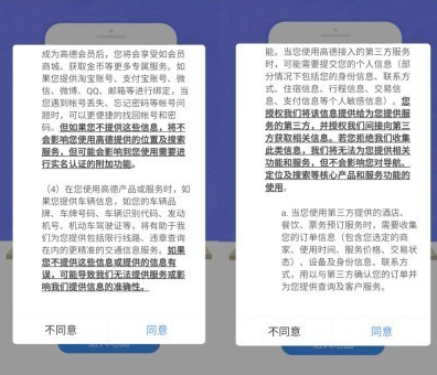而笔者只剩下两种选择,“同意”还是不同意。看似是两种选择,但其实留给笔者的只有一种选择:不同意高德地图的隐私条款,就完全无法使用这款APP。如果想使用高德地图,那就不得不接受这样严苛的隐私条款,将自己的隐私信息全部交出去。不过一旦高德地图被黑客破解,或者与第三方合作不畅,那么大众的隐私信息就有了泄露的风险。