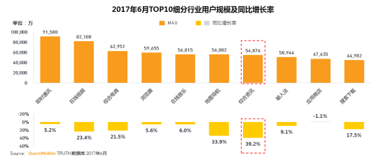 报告数据显示,2017年6月,我国综合资讯独立APP行业月度用户总量已近5.5亿。与去年同期相比,增长率达39.2%。目前,综合资讯已成为移动网民第七大细分行业。