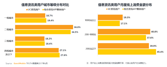 值得一提的是,UC资讯用户中,35岁以下用户居多,占到83.2%,同时超过50%分布在一二线城市,具有较高的消费能力。从用户特征来看,UC资讯信息流显示出优异商业优势。