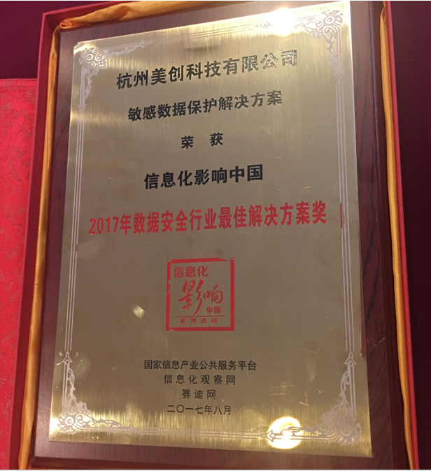 8月25日,在2017中国信息化创新发展大会上,美创科技凭借在敏感数据保护上的突出表现,荣获数据安全行业最佳解决方案奖。