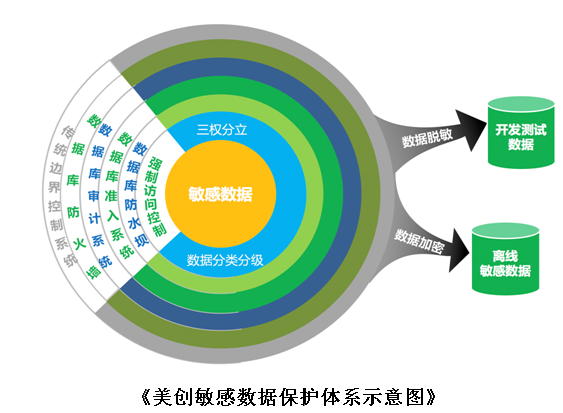 美创科技敏感数据保护体系以敏感数据为核心,以三权分立为基础,通过数据分类分级管理好敏感数据,并由内而外采用多道安全措施进行层层防御。针对敏感数据的共享与访问通过数据脱敏与数据加密产品保障数据的保密性,防止敏感信息泄露。