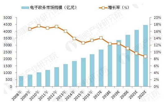 随着我国政府向公共服务型政府的转型,政府对民生问题的重视不断加强,电子政务是重要抓手。特别是十八大将信息化列为“新四化”(新型工业化、信息化、城镇化、农业现代化道路)之一,意味着信息化将成为推进我国经济社会转型的核心力量之一。在这些因素的推动下,预计未来5年内,电子政务仍将保持13%左右的稳定增长,到2022年或可达4456亿元。