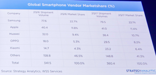 据Strategy Analytics,苹果手机2017年2季度市场份额为11.4%,缕续大幅落后三星,但较于2016年的市场份额已经企稳并缓慢回升。