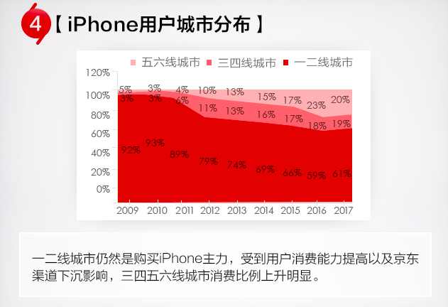 据京东大数据统计,2010年以前,IPhone只是中国一、二线城市消费者的“专享品”,份额一度超过90%,但受到用户消费能力提高以及渠道下沉的影响,三线及以下城市的消费比例上升明显。目前,一二线城市消费者份额维持在六成左右,三四线与五六线城市各占二成左右,近两年来,甚至出现了五六线城市的份额超过了三四线城市的情况。