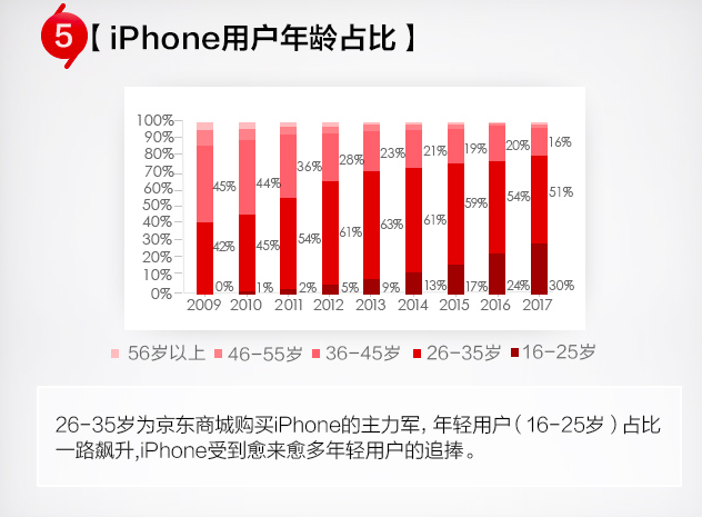不管如何,苹果依然是一个让人尊敬的时代品牌。近日,中国最大的手机零售平台京东发布了以“2009-2017果然精彩”为主题的京东平台iPhone大数据报告,该报告涵盖了近十年来京东销售的iPhone数据,从购买者的年龄、性别、学历以及产品喜好等角度进行分析,揭示了iPhone近十年来在京东平台消费趋势的变化。