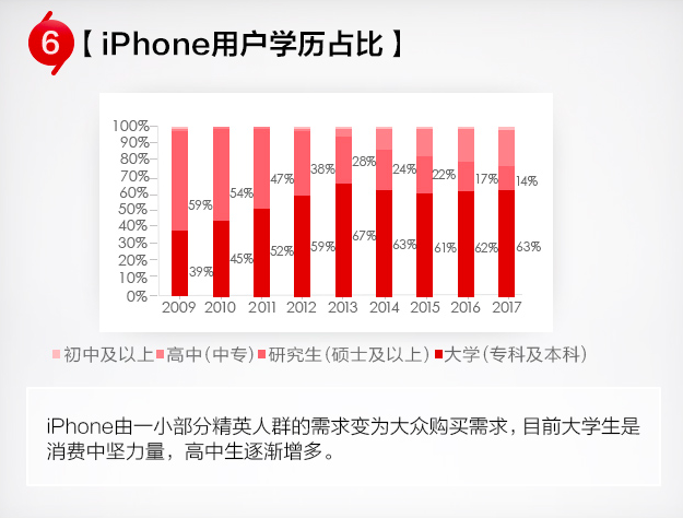 根据京东公布的iPhone数据显示,在京东上购买iPhone的用户中,有51%的人是26-35岁,并且16-25岁的年轻用户占比一路飙升,高中生的比例也在增加,iPhone受到了越来越多年轻用户的追捧。所有在京东购买iPhone的用户中,有90%以上是大学及以上学历,高学历的人群手机消费的目标依旧为iPhone。