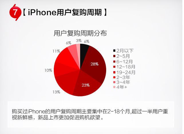 除此外,通过该数据还可以看出,iPhone 6成为京东好评率最高的手机,达到98.3%;而iPhone用户复购周期主要集中在2-18个月,超过一半用户重视新鲜感等。