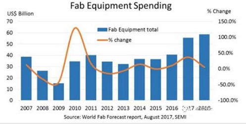 SEMI(国际半导体产业协会)日前发布最新「全球晶圆厂预测报告」(WorldFabForecast),指出全球晶圆厂设备支出再次刷新纪录。报告显示,在所有SEMI追踪的296座前端晶圆厂房与生产线当中,有30座晶圆设备支出超过5亿美元。2017年晶圆设备支出(含全新与整新)预计将成长37%,创下550亿美元的最新年度支出纪录。SEMI同时也预测2018年晶圆设备支出成长率将再度攀升5%,同时也将再次写下580亿美元的新纪录。SEMI台湾区总裁曹世纶表示,先前最高的支出纪录是2011年创下的400亿美元。按目前情势来看,2017年支出预估将比该数字高出大约150亿美元。