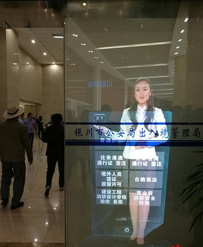市民大厅内的银川市公安局出入境管理局门口虚拟人像指引市民前往办理手续