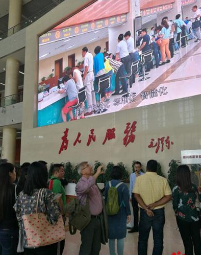 当天,我们一走进市民大厅,就发现迎面墙上巨大的电子屏幕格外引人注目。屏幕上放映着中国的各级领导到这个大厅视察工作的情形,反映出中国领导人对银川市政务改革的重视。巨型电子屏的一侧有一个柜子,里面保存着过往银川市人民办理各部门手续相关的50多枚公章。通过这些公章我完全可以想象出以前人们办事要找多少部门,有多少不便。政务改革后,50多枚公章集中成为1枚,各种审批程序耗费的时间也从原来的两三个月缩短到仅仅需要1周到10天左右,大大节约了市民的时间和成本。