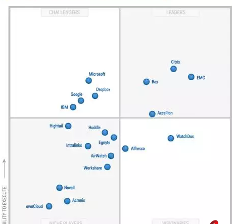 世界顶级科技咨询公司 Gartner 曾针对 2014 年美国市场上企业级云存储公司,根据其产品的便捷性、安全性、存储容量等性能做过一个评级,并将其中优秀的公司根据各自特点作了一个分类: