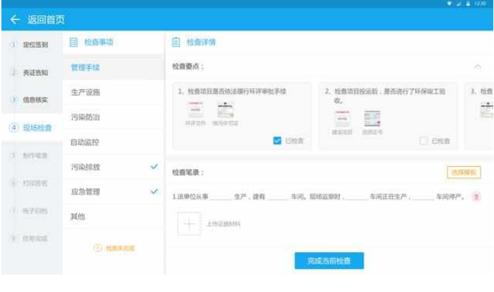到达现场后,打开执法移动终端智慧执法平台,系统自动完成定位报到,并启动规范执法流程,逐步完成从亮证告知、现场检查、证据采集、制作笔录等完整的执法步骤,确保检查无误、信息完整、处理规范,所有现场情况及资料实时在线同步至执法中心进行保存。