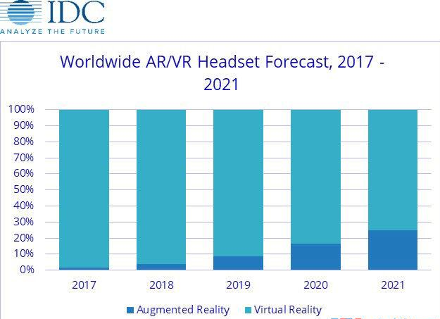 IDC移动设备高级研究分析师吉特什路·乌布拉尼(Jitesh Ubrani)表示:"包括在数量上和功能上,今天的AR头显出货量只占我们对其在未来五年内的预期的一小部分。AR头显在2021年将达到300亿美元以上的营收,几乎为VR的两倍,因为早期采用者来自于商业领域,所以大多数AR头显的平均销售价格将更高。与此同时,大多数消费者将在移动设备上体验AR,但基于苹果ARKit和谷歌ARCore的应用程序出现在消费者头显上只是时间问题。