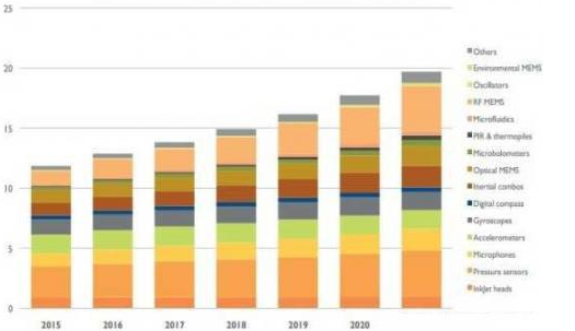 根据Yole Development预测,2015到2021年间全球MEMS(微机电系统)市场的年复合增长率约为8.9%,尽管届时市场规模可达200亿美元,但与先前由于智能型手机、 平板计算机等消费电子产品拉动的两位数以上的增长相比,市场成长明显放缓。