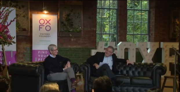 苹果首席执行官蒂姆·库克(Tim Cook)今天在牛津大学出席了牛津创业基地的揭幕仪式。在参加完剪彩仪式之后,他和牛津大学的教授和管理人员一起坐下来与牛津大学生进行问答环节。