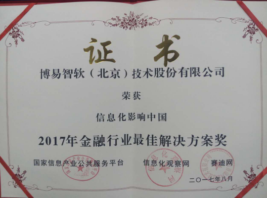 日前,由国家信息产业公共服务平台、信息化观察网、赛迪网共同主办的2017中国信息化创新发展大会暨“信息化影响中国·2017奖项评选”高峰论坛在北京隆重举行。博易智软(北京)技术股份有限公司(以下简称“博易股份”)应邀出席本次大会,凭借领先的行业解决方案和卓越的技术服务能力等优势,经大会组委会、业内专家、资深编辑、网络推选等层层评选与考核,一举斩获“2017年金融行业最佳解决方案奖”,这也表明博易股份在大数据领域又一次得到了业界的权威认可。