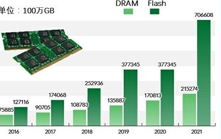 事实上,存储器的好日子可能才刚刚开始。IHS 对DRAM(浅色)和FLASH (深色)的预测显示,未来5年两者都有3-6倍的需求增长,图中数据的单位为惊人的100万GB=1000TB。这个需求来自人工智能、物联网的持续部署,以及由此产生的大数据持续爆发。在个人消费品以外,越来越庞大的数据中心,也产生了饥渴的存储需求。
