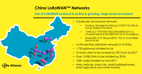 实际上,目前全球已有52张LoRa网络覆盖100多个国家,中国市场对于LoRaWAN协议的采用主要聚焦于针对智能城市、智能建筑/家居、智能农业和工业等垂直领域,目前国内已有3个公开发布的LoRa网络,包括覆盖整个贵州省的贵州中安云网、覆盖广州南沙区(803平方千米)的广州中国科学院计算机网络信息中心的网络以及覆盖西安北林区的陕西广电网络。此外,中国还有16个私有/试验的LoRaWAN(>10 GWs)网络并已安装了1,732个网关。