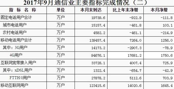其中,3G用户1.4173亿户,比上年末净减2907.3万户;4G用户9.46761亿户,比上年末净增1.76812亿户。