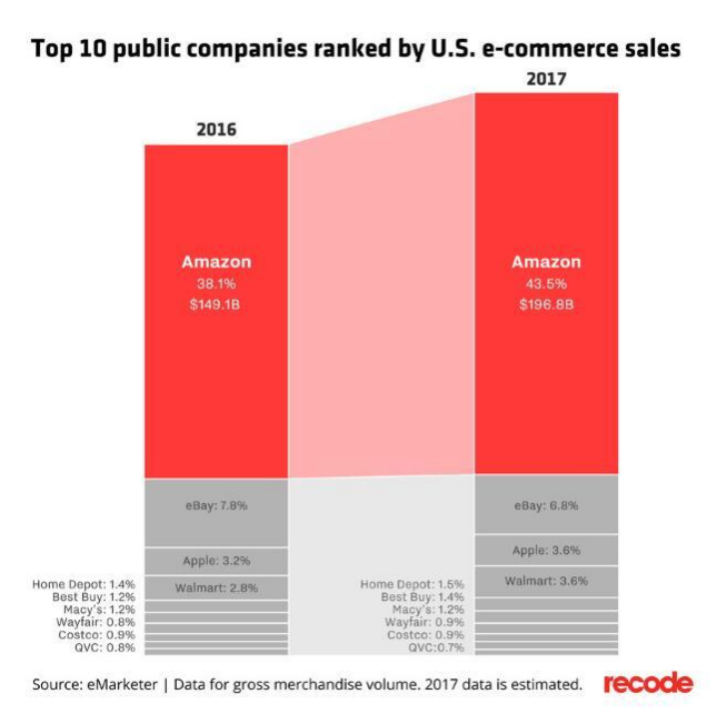 亚马逊在2016年的市场份额为38%,销售额为1490亿美元,仍然是美国最大的电子商务公司,eBay、苹果和沃尔玛紧随其后。