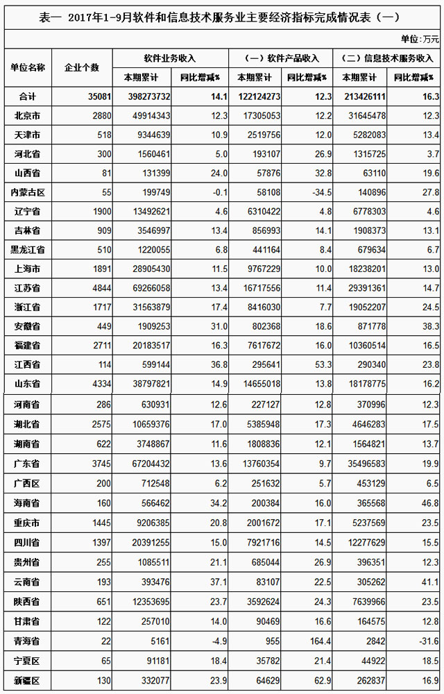 2017年1-9月软件和信息技术服务业主要经济指标完成情况表(一)