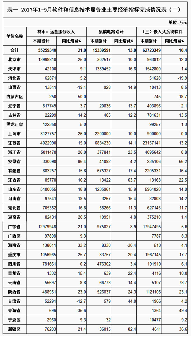 2017年1-9月软件和信息技术服务业主要经济指标完成情况表(二)