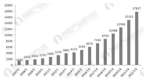 2007-2022年中国安防行业市场规模及预测(单位:亿元)