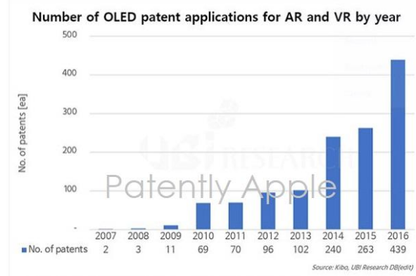 报告引用了韩国知识产权局(KIPO)的资料,其中显示为VR/AR产品而设的OLED显示屏的申报数量每年递增(尤其是过去3年),其中2014年240个,2015年263个,2016年439个。2014年起,此类申报数量迅速增长。