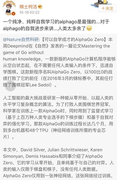 柯洁对此感叹道:“对于AlphaGo的自我进步来讲……人类太多余了。”