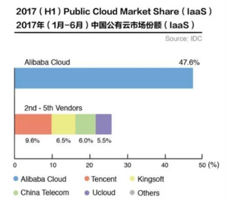 11月1日,权威研究机构IDC发布了2017年上半年中国公共云IaaS市场份额调研结果。数据显示,阿里云市场份额比2016年底上升7个百分点,市场份额扩大至47.6%,领先优势不断扩大。同期,市场第2至5位云服务商市场份额分别为9.6%、6.5%、6%和5.5%。
