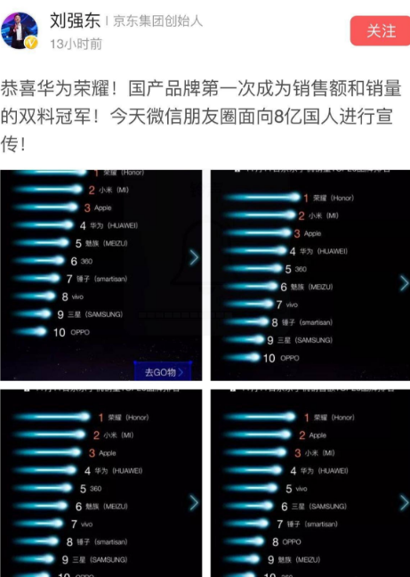 11月12日上午八点,京东集团CEO刘强东发了个祝福:“恭喜华为荣耀!国产品牌第一次成为销售额和销量的双料冠军!今天微信朋友圈面向8亿国人进行宣传!”配图是今年双11京东手机实时竞速排行榜的截图,显示荣耀在京东平台上的销售额和销量均力压苹果和小米。