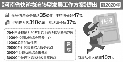 根据《河南省快递物流转型发展工作方案》,到2020年,全省快递业总体规模要位居全国前列,其中业务量达到35亿件,业务收入达到310亿元;建成20个日处理能力50万件以上的快递物流示范园区,建成1000个校园快递综合服务中心、2000个乡镇快递综合服务站、30000个快递物流农村公共取送点;行业新增从业人员10万人以上;年业务收入超10亿元的骨干网络企业达到7个。