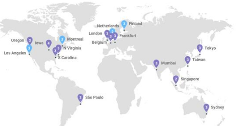谷歌云平台正在运营和计划建设的区域和可用性区域的数量(紫色为正在运营,蓝色为计划建设)