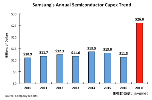 IC Insights预计,三星在2017年第四季度半导体行业资本支出为86亿美元,将占到其262亿美元总开支预算的33%。同时,三星半导体四季度销售额有望占到全球半导体销售额的16%左右。