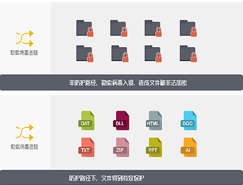用户对防护路径和进程白名单设置完成后,白名单中的进程拥有对已启动的防护路径下文件的所有操作权限;非白名单进程拥有防护路径下文件的读权限,无其他权限。 勒索病毒进程即使访问路径下文件,由于没有文件的操作权限,也不会导致文件被非法加密的后果,从而达到防勒索病毒的目的。