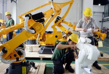 走进江宁经济技术开发区的南京埃斯顿自动化股份有限公司生产车间,仿佛进入了一个“人机交互”的世界。为数不多的工人正对一台台型号、外形、功能不一的工业机器人进行调试,很快,这些机器人就将发往全国各地的制造业工厂,在折弯、码垛、焊接、3C产品抓取等岗位“上岗”,取代人工劳动。