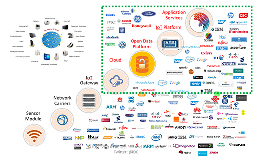 从产业链的角度来看,IDC将物联网应用分为传感器/模块、联网/传输服务、网关、云端服务、数据开放平台、物联网/产业平台,以及整合应用服务等七个层次,如图1,值得特别注意的是,相较于传感器/模块、联网/传输服务、网关等领域,云端、开放数据平台、物联网平台与整合服务等四个层级的边界日趋模糊,有越来越多的业者透过自行开发或者是策略联盟的方式提供一站式服务。