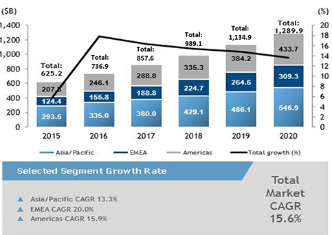 根据IDC研究显示,全球企业花费在物联网的支出将从2015年的6,252亿美元成长到2020年的1.29兆美元,年复合成长率达15.6%。若是从地域的角度来看,亚太地区国家投入的物联网预算最高,占全球比重的40~45%;若是从年复合成长率这个角度来看,则是以EMEA(欧洲/中东/非洲)市场的成长力道最为强劲,年复合成长率达20%,如图2。