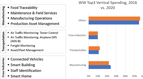 若是从产业的角度,从2016年到2020年都是以制造、交通以及一些跨产业应用为主,如图3。也就是说,资产密集型产业将主导全球物联网发展。在制造业方面,包括食品追踪、维护与现场服务、制造流程优化,以及产线资产管理等需求会越来越高;在交通业方面,则是以空中交通监控(塔台与飞机)、货运监控,以及资产/车队管理等应用为主。值得特别注意的是,除了制造业与交通业的应用场域较为常见,还有一些跨产业的应用情境也将日趋普及,例如智慧车、智慧建筑、智能家居与个人身份认证相关的应用。