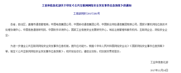 工信部近日对外公布印发的《公共互联网网络安全突发事件应急预案》,明确了事件分级、监测预警、应急处置、预防与应急准备、保障措施等内容。预案自印发之日起实施。