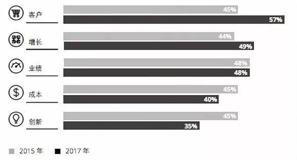 德勤2017年的调研显示,CIO们最新公认的企业发展重心为客户、增长、绩效、成本和创新。而这一结果,与两年前的分布情况有了微妙的改变(见下图)。
