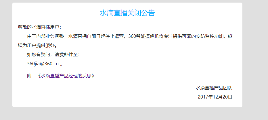 北京12月20日,今天上午,360水滴直播官网发布公告表示:由于内部业务调整,水滴直播自即日起停止运营。但360智能摄像机将专注提供可靠的安防监控功能,继续为用户提供服务。